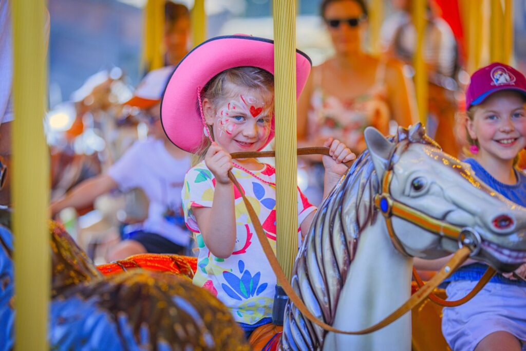 Au son de l’orgue de barbarie et sous ses centaines d’ampoules, venez faire un tour sur le grand carrousel de chevaux de bois.
